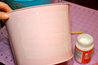 Then, add a layer of Mod Podge to the bucket. It is okay that the Mod Podge is not perfect. It cleans off easily with a damp rag. {How many times can I say Mod Podge??}